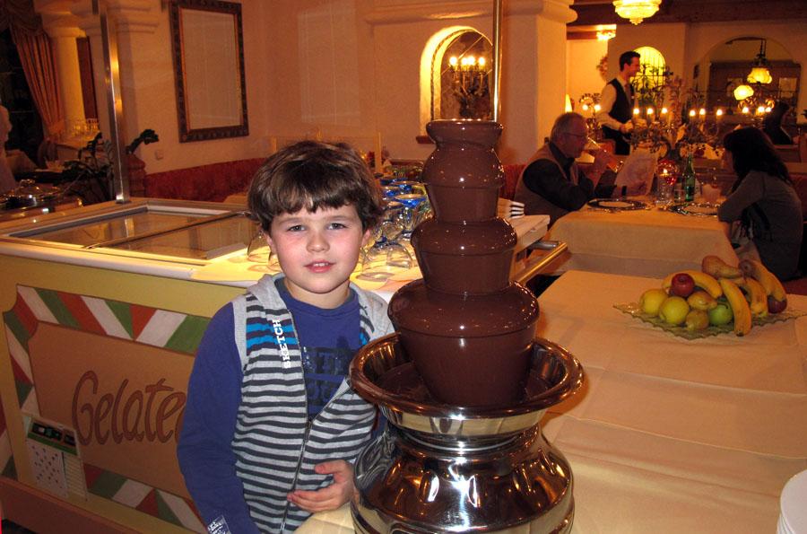 Onder: Deze foto moest ik plaatsen op dringend verzoek van kleinzoon Kees . Hij staat hier bij het stromende chocolade fontein in het hotel, waaruit de boys naar hartenlust konden scheppen om hun ijs bekers van een toplaag chocolade te voorzien. Jan en Kees waren ZEER onder de indruk van dit apparaat !!
