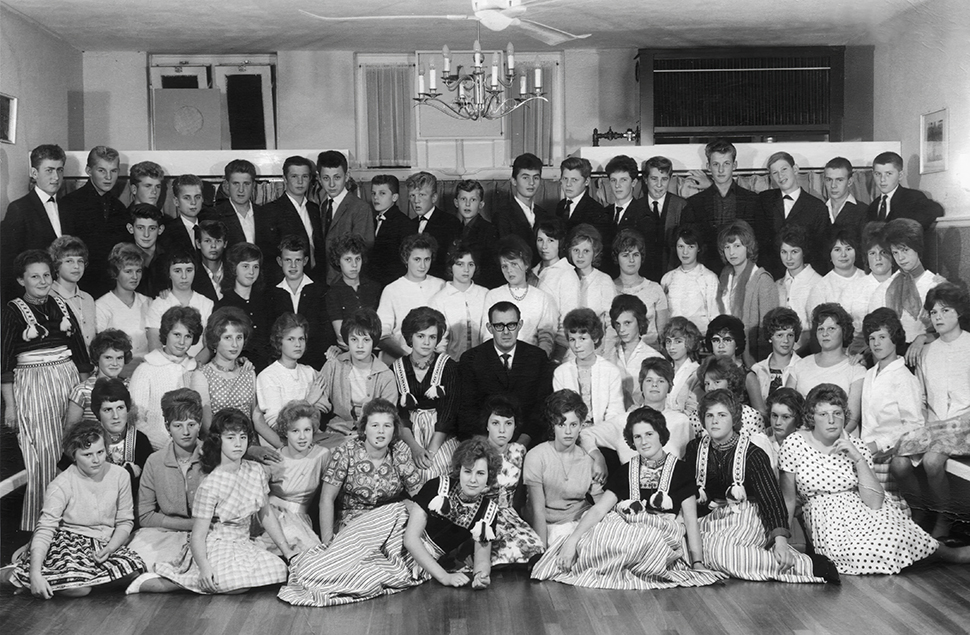 De lichting 1963 van dansschool Sombroek aan de Julianaweg in Volendam. De 6de persoon linksboven is Evert (16) en de 11de van links is Jan (15)