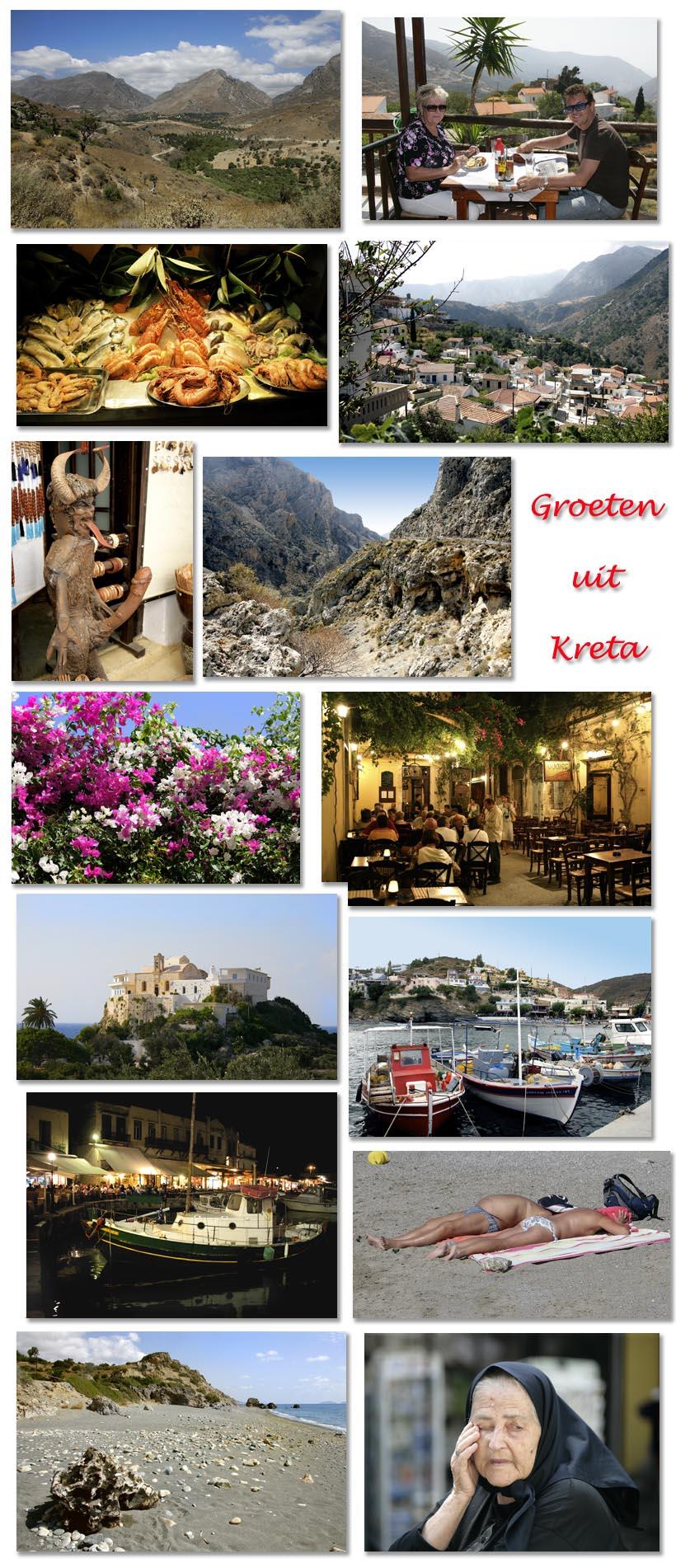Hier onder een collage uit de vele schitterende foto’s die we op Kreta maakten, de avondfoto’s zijn gemaakt in Rethymno. Het haventje met de 3 bootjes is Agias Galini. De zonneaanbidders rechtsonder zijn Duitsers net na de maaltijd en wat biertjes.
