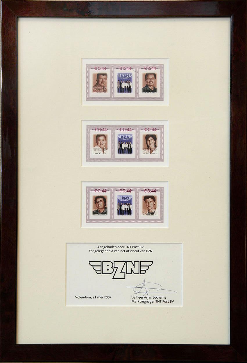 Vandaag in de serie foto’s van onderscheidingen de officiele postzegel die uitkwam ter gelegenheid van het BZN afscheid.Een ingelijste verzameling van de postzegels met op elke postzegel een van onze koppen. Het was daarna een leuke ervaring om na het afscheid tientallen schriftelijke reacties te ontvangen, met m’n eigen kop op de opgeplakte zegel. Wie maakt zoiets allemaal mee. Zoals ik al eerder zei, sta ik nu pas echt stil bij de talloze in hectische tijden verkregen onderscheidingen, die mij hier nu in complete rust omringen. Nu ik de tijd en het geduld heb om te genieten van al die enorme blijken van waardering voor ons levenswerk BZN. Ik kijk met voldoening terug op een fantastische carriere. Welliswaar had BZN voor mij nog een paar jaar mogen duren en had ik graag nog een laatste BZN CD gemaakt, maar ik ben heel blij dat ik nu voor mijn rust gekozen heb, nadat ik zo’n mooi afscheid heb meegemaakt. Afscheid van de dierbare fans, die ons het extreme succes allemaal zo gegund hebben. Op een absoluut hoogtepunt. Vooral dat laatste geeft extra voldoening aan de volkomen vrijheid waarvan ik nu mateloos geniet.