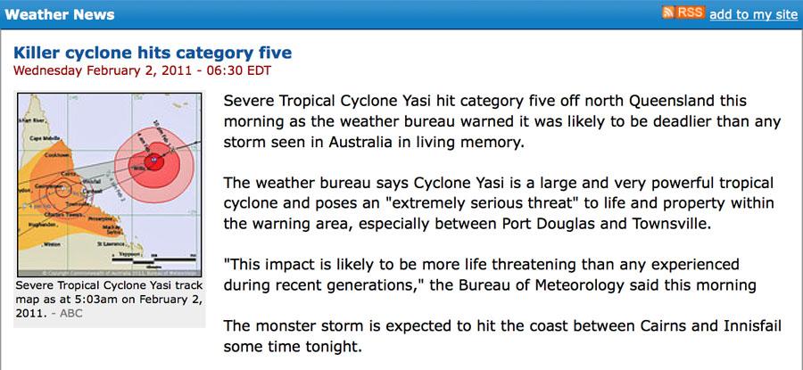 Onder: Het onderstaande bericht van dinsdagavond half 9 – het is in Australie dan woensdag half 7 s’ morgens – spreekt van de dodelijkste cycloon die Australie ooit getroffen heeft