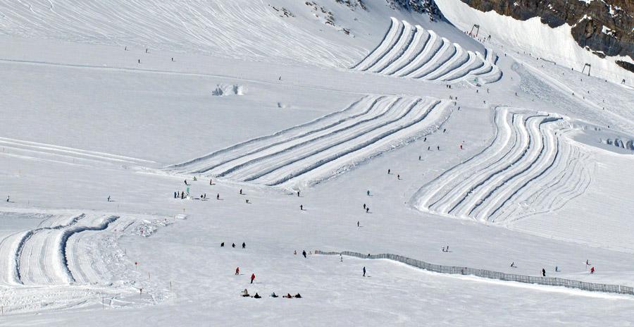Onder: Wat is dit nou weer voor een raar landschap, daar midden op die Gletscher, waar al die mensen langs en doorheen skien ? Het zijn sporen van bulldozers die hier sneeuw weghalen om die vervolgens naar sneeuwarme delen van andere pistes te vervoeren.