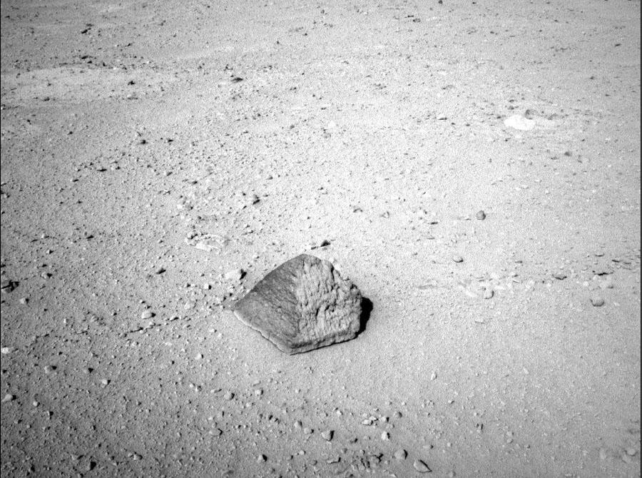 Onder: De Mars Rover kwam een paar dagen geleden tijdens een van zijn ritten op het Mars oppervlak tot stilstand op 2,5 meter afstand van deze rots die ongeveer de afmeting heeft van een voetbal.