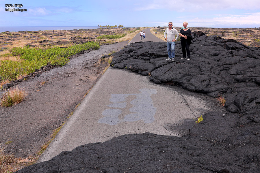 We zijn nu helemaal van de Mauna Loa afgedaald naar de Oceaankust, waar een uitbarsting in 2003 uit de Kliauea vulkaan over de weg heen stroomde die nu dus gesloten is. We moesten hier 1 mijl voor lopen vanaf een parkeerterrein verderop de weg, een heel warm klusje. Dit is echt een heel vreemd gezicht, waaruit blijkt hoe nietig wij als mensen zijn, geheel ondergeschikt aan de Moeder Natuur die volkomen haar eigen gang gaat