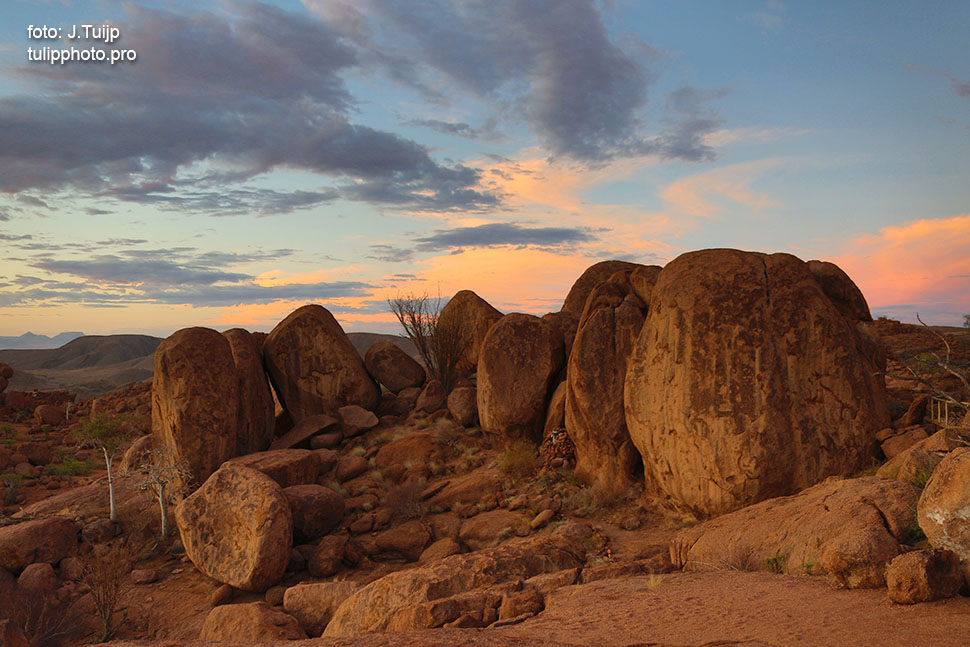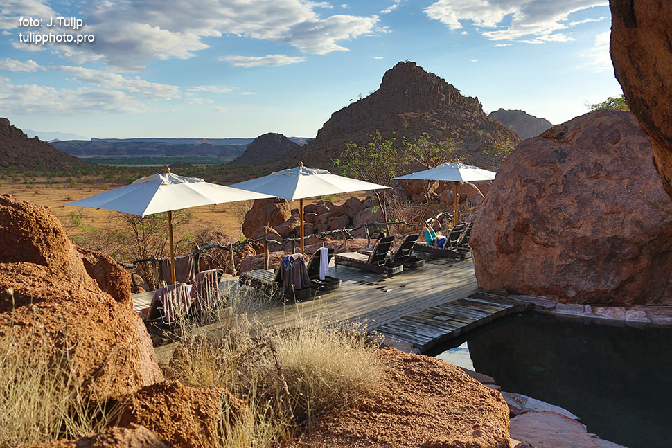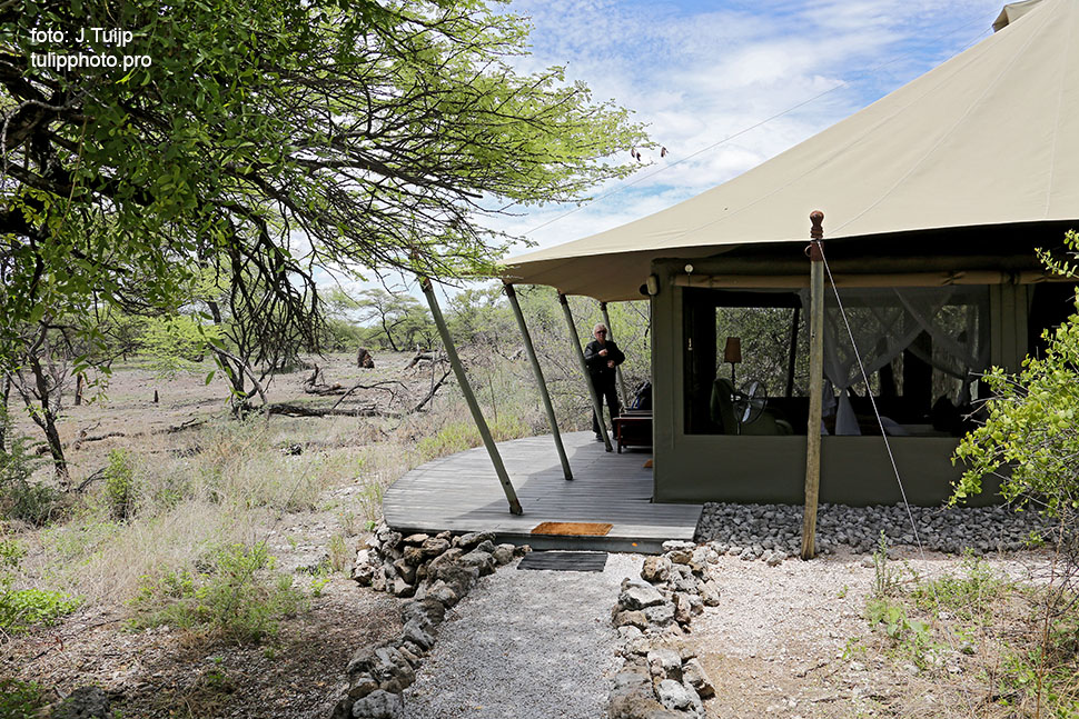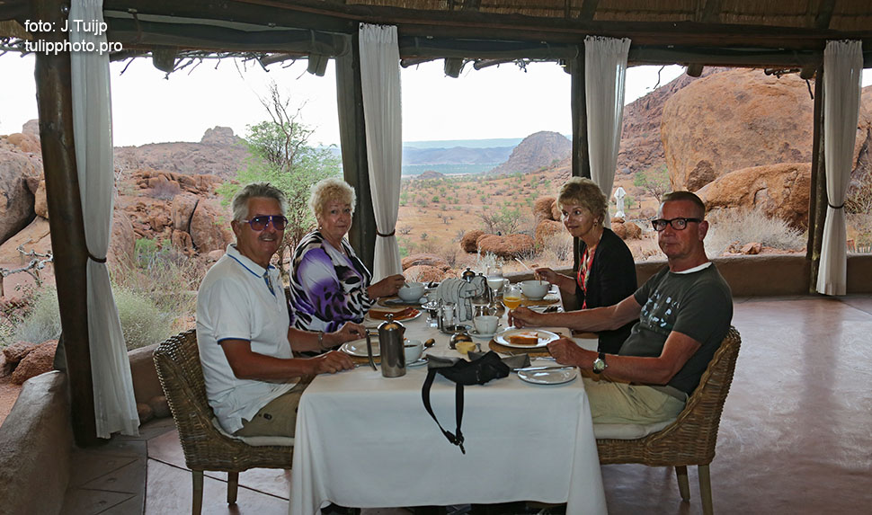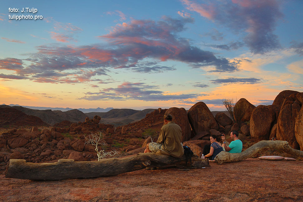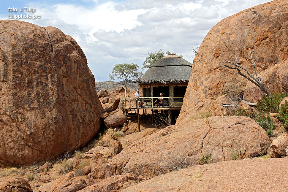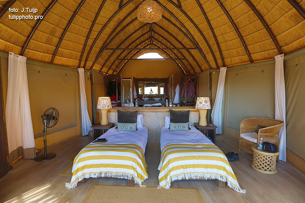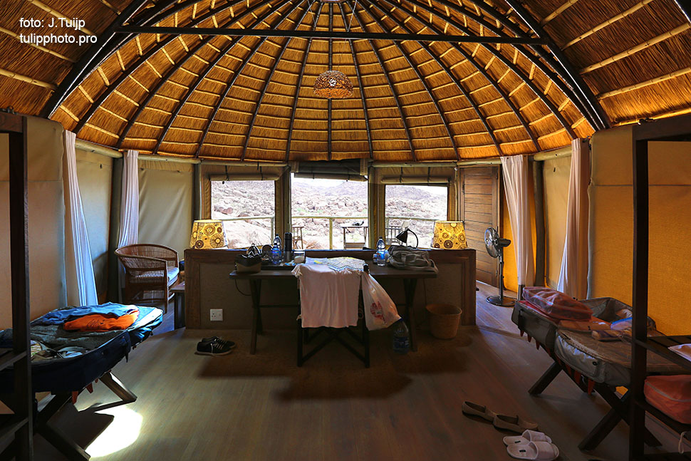 In veel van de lodges onderweg, slaap je in comfortabele luxe uitgevoerde tenten. Bijzonder was de lodge boven op de rand van de schitterende Fish River Canyon, in het zuiden. Ook bijzonder was het spookstadje in het Sperrgebiet bij Luderitz, waar al bijna een eeuw lang op een afgeschermd stuk woestijn diamanten gevonden worden.