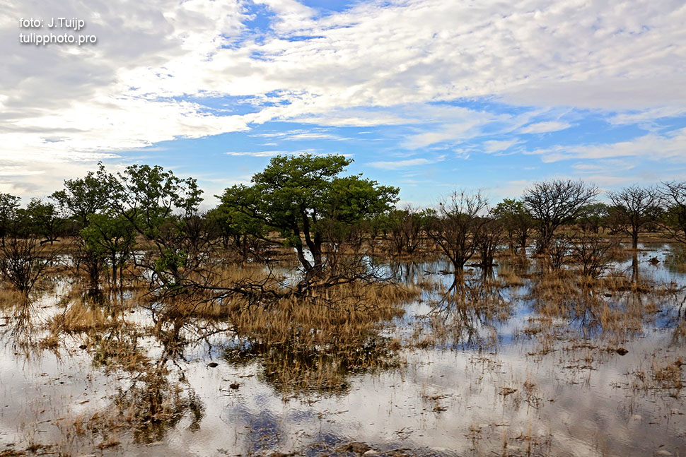 Vanuit Kasane vlogen we naar een afgelegen lodge in de Okovanga Delta die alleen bereikbaar is met een klein vliegtuigje. Deze delta is uniek omdat hij niet in een zee uitmondt. Het water uit het hoger gelegen aangrenzende Angola, zorgt voor de aanwezigheid van een groot scala van allerlei soorten dieren. Met een gids die slechts “bewapend” was met tak, maakten we een bush walk, tussen de leeuwen en nijlpaarden in. We moesten geen opvallende kleding dragen en achter elkaar in gelid lopen. “Dan zien de leeuwen en cheeta’s geen prooi in ons” aldus de gids…… Toen we echt leeuwen tegenkwamen had ik de rillingen over m’n rug. Op een nacht maakten we hier in onze tent een onweer mee zoals we dat nooit eerder hadden gezien.