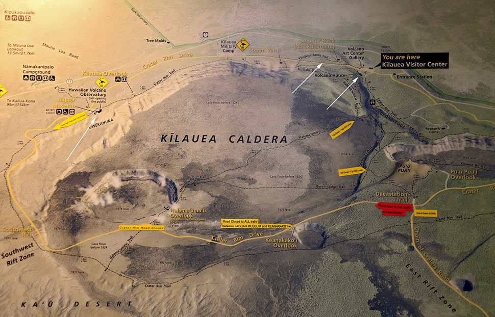 Op deze luchtafbeelding ziet men de Kilauea Caldera, boven op de Kilauea vulkaan; de Caldera is als het ware een ingezakte vloer rondom de eigenlijke Halemaumau Crater ( links v/h midden). Deze krater is nu vol lava gelopen en ontploft. De inzakking er omheen, de Caldera, ontstaat door de ruimte die er onder ontstaat als gevolg van de uitgestoten lava. Bij de meest rechtse witte pijl aan de krater rand staat het Volcano House. Van hieruit hadden wij een prachtzicht op de Caldera en de krater.