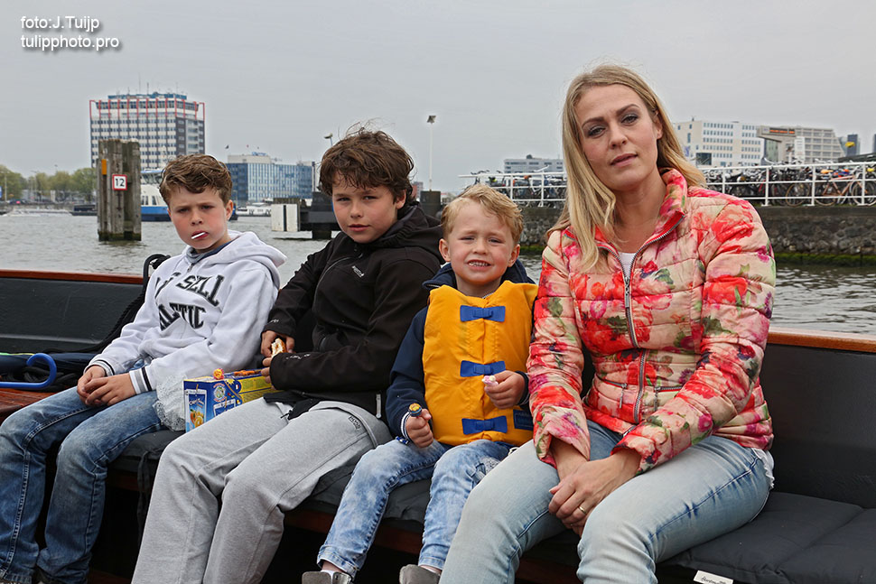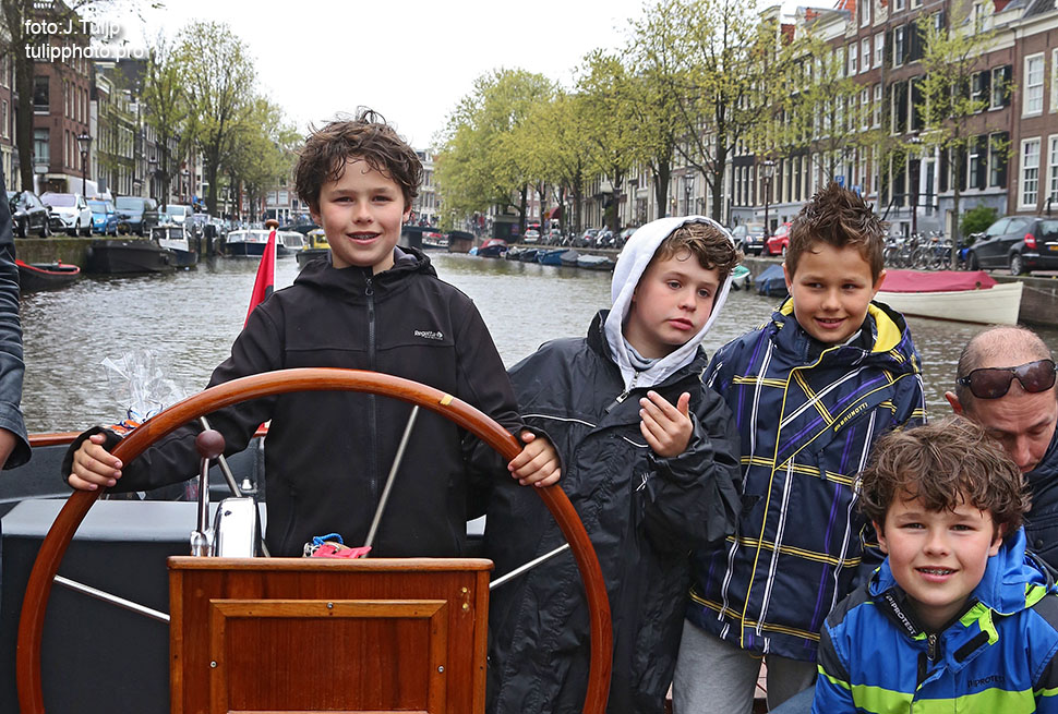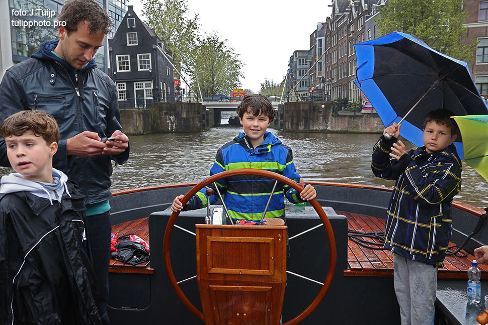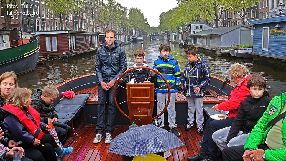 Met onze kinderen en kleinkinderen, onze Oostenrijkse gasten Max und Cristl en Mary’s zus Jantien en zwager Gerard waren we uitgenodigd door onze neef Christiaan Springer om op zijn sloep door de Amsterdamse grachten te varen; ondanks de regen werd het een groot feest !