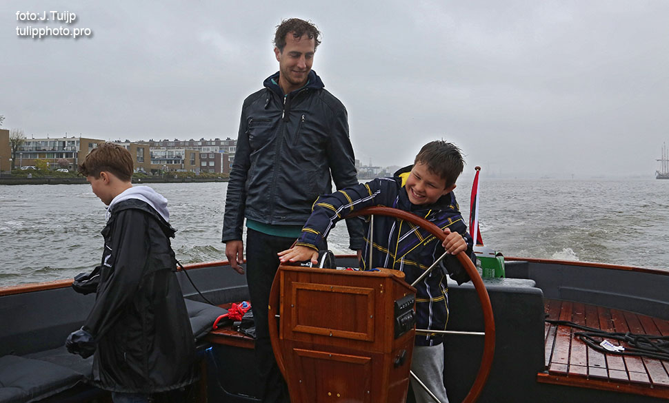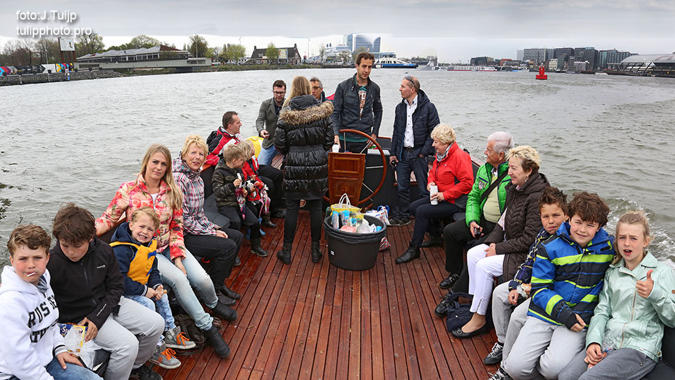 Onze neef Christiaan Springer heeft met een aantal vrienden een sloep gebouwd, waar ze in Amsterdam mee rondvaren. Hij had ons en onze kinderen en kleinkinderen al eens een keer uitgenodigd en omdat onze Oostenrijks vrienden Max en Cristl uit Saalbach afgelopen weekend een paar dagen bij ons op bezoek waren werd het dus zondagmiddag.