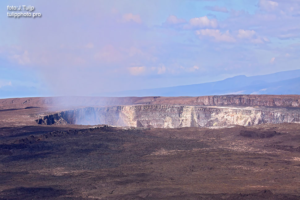 De Halemaumau krater, zoals ik die fotografeerde vanuit ons hotel “Volcano House”. Hij rookte en smeulde dag en nacht. Om de krater heen zien we de ingezakte Kilauea Caldera. De krater op de foto is nu tot 2 meter onder de rand toe vol gelopen met kolkende lava; er is nog geen gevaar voor de omliggende dorpen maar er is wel een waarschuwing afgegeven door de HVO (Hawaian Volcano Observatory