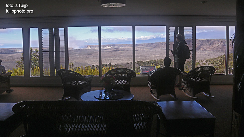 Vanuit ons hotel “Volcano House” aan de rand van de Kilauea Caldera zagen we de door de ruiten de Halemaumau krater, waar dag en nacht rook en gloed uit kwam. Dit was te zien vanaf het terras buiten, of binnen in een speciaal daartoe ingerichte zaal vanuit luie rieten stoelen. Dat zo’n vulkaan ook nog eens zomaar kan uitbarsten, daar sta je niet bij stil; en hoewel van een echte grote uitbarsting nog geen sprake is, is hij nu wel alarmerend actief geworden. De vraag is hoe lang het hotel nog open blijft …
