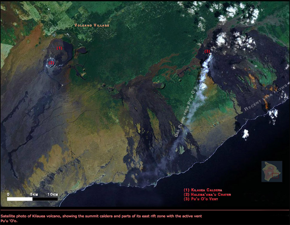 De onderstaande foto van het zuidoostelijk deel van Big Island met bij (3) de Pu’u O’o krater die vorig jaar veel lava heeft uitgebraakt, en dorpen bedreigde. Wij vlogen daar met de heli overheen en maakten er foto’s van. Nr (1) is de Kilauea Caldera op de Kilauea vulkaan en daarin bij (2) is de Halemaumau Krater te zien die nu actief is geworden en is volgelopen met lava. Op de rand van deze Caldera (1 ) – een verzakte bodem – staat het hotel “Volcano House” waar wij logeerden afgelopen zomer.