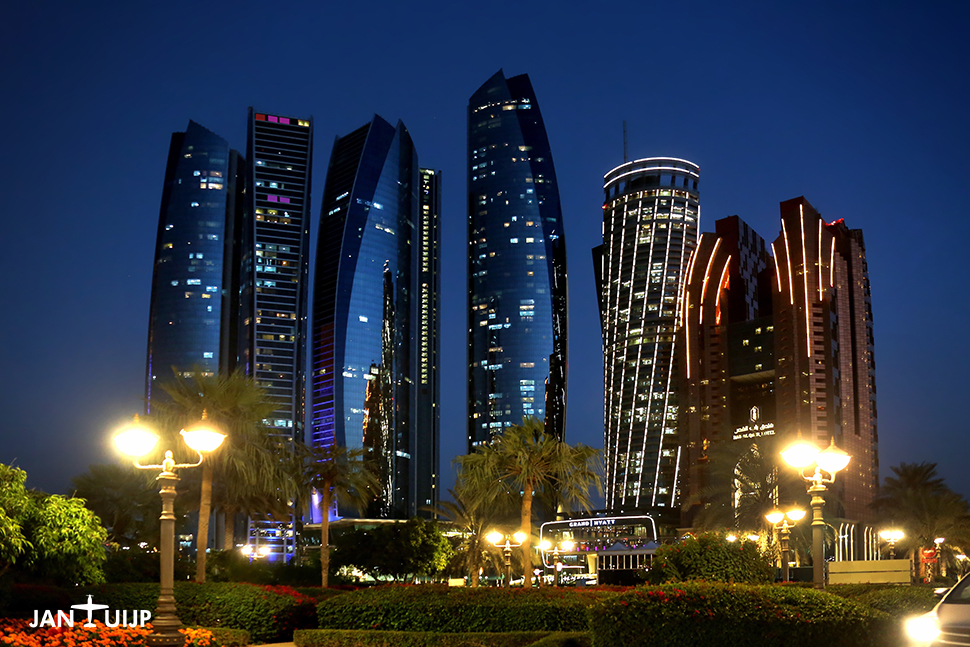 60 km van de klimaat vergaderplekken in Dubai; Qast Al Watan, het Presidentiele paleis van Abu Dhabi; het mooiste en meest kostbare paleis ter wereld, waarin Mohammed bin Zayed Al Nahyan woont, de President van de Verenigde Arabische Emiraten en de Emir van Abu Dhabi, met rechts de drie gebouwen voor zijn 3 vrouwen. In het hotel hiernaast – een van de duurste hotels ter wereld logeren honderden klimaat vergaderaars
